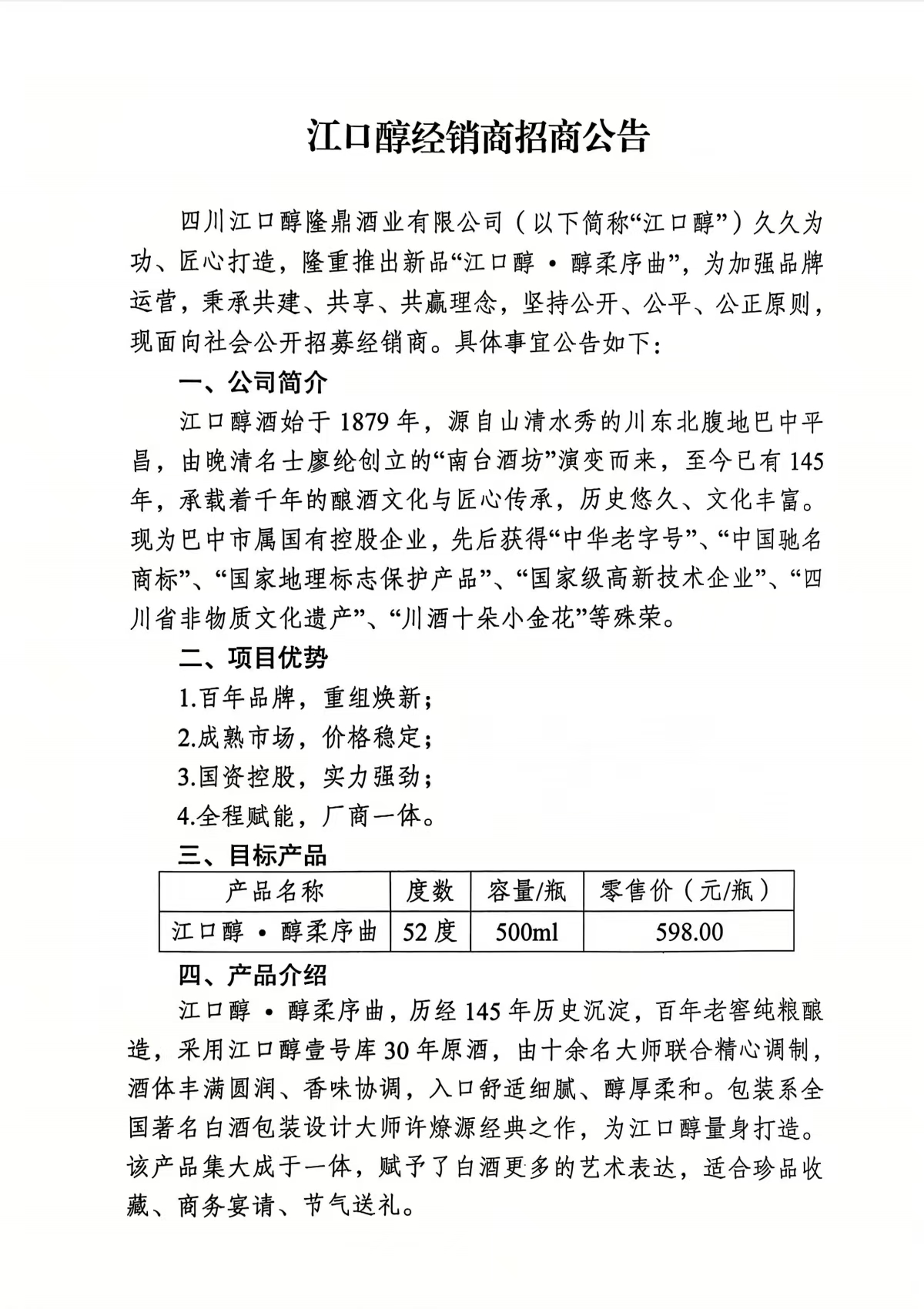 江口醇新品“醇柔序曲”,經(jīng)銷(xiāo)商招商公告!